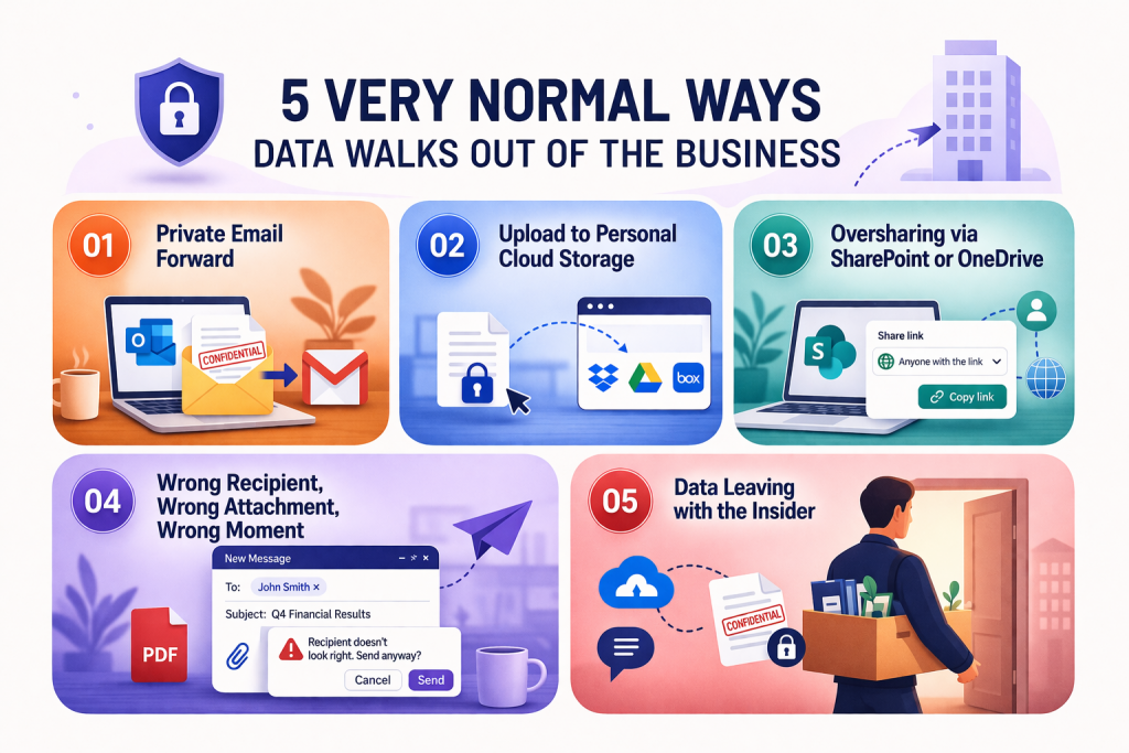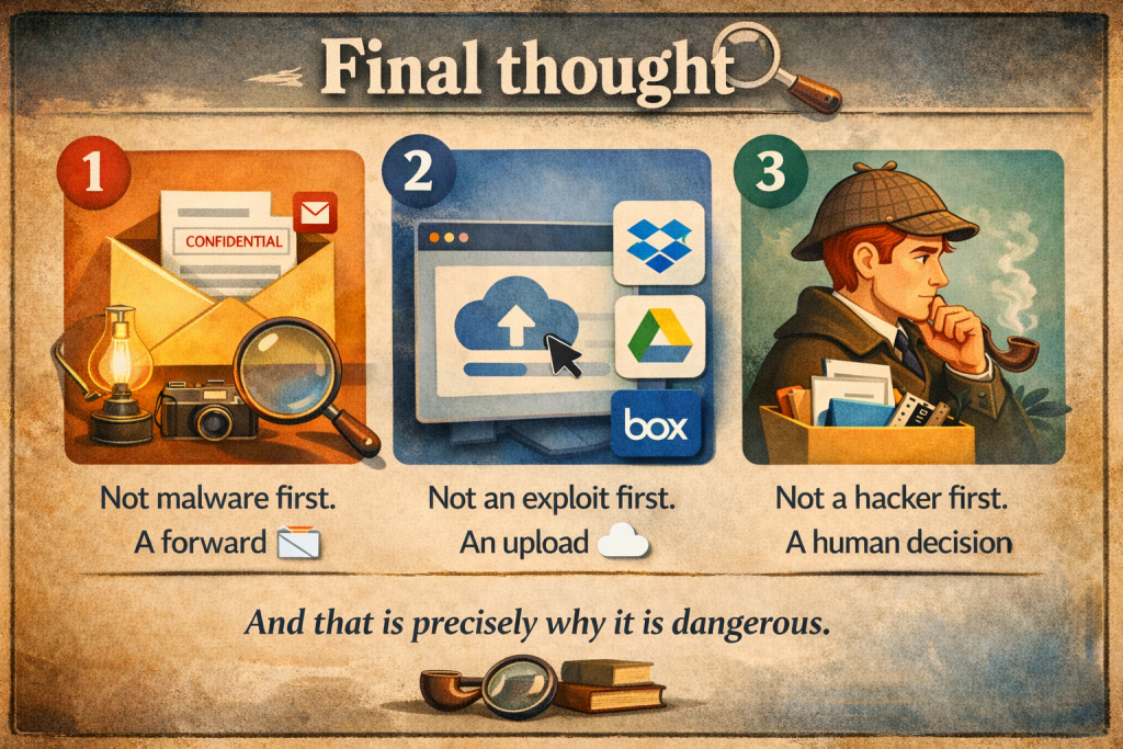 Someone sends a file to their private mailbox because they want to finish work later. Someone uploads a document to a personal cloud service because it feels faster. Someone shares a link externally because collaboration needs to move. Someone is about to leave the company and suddenly starts collecting information they no longer really need.