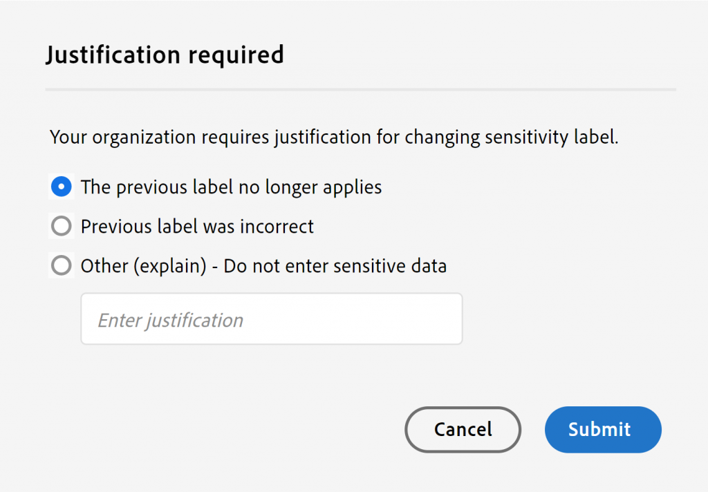 Auch das Feature zur Begründung bei Abstufung des Labels ist vorhanden und wird in die Audit Logs übertragen!